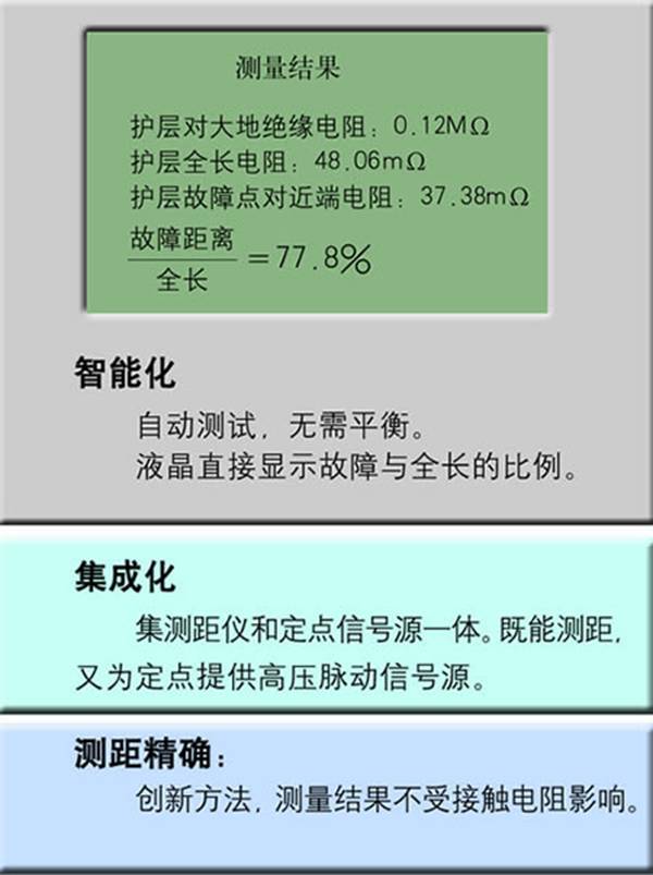 2.液晶直接顯示測距的比例信息,操作簡便?梢允褂眯揪進行護層故障測距,克服了高壓電橋因現(xiàn)場沒有絕緣良好的護層而無法測距的缺點。