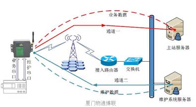現(xiàn)場(chǎng)采集設(shè)備的業(yè)務(wù)串口與維護(hù)串口分別與無(wú)線模塊化的串口一和串口二相連。正常通信的時(shí)候業(yè)務(wù)數(shù)據(jù)只走通道一,實(shí)現(xiàn)配網(wǎng)自動(dòng)化。當(dāng)需要對(duì)采集設(shè)備進(jìn)行維護(hù)的時(shí)候維護(hù)系統(tǒng)服務(wù)器與無(wú)線模塊建立通道二,實(shí)現(xiàn)遠(yuǎn)程維護(hù)的功能。